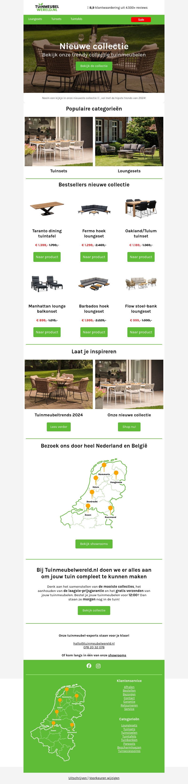 Bekijk onze nieuwe collectie tuinmeubelen en profiteer van speciale aanbiedingen. Van loungesets tot tuinsets, onze trendy meubels zijn ideaal voor jouw tuin. Mis het niet en shop nu voordelig online!