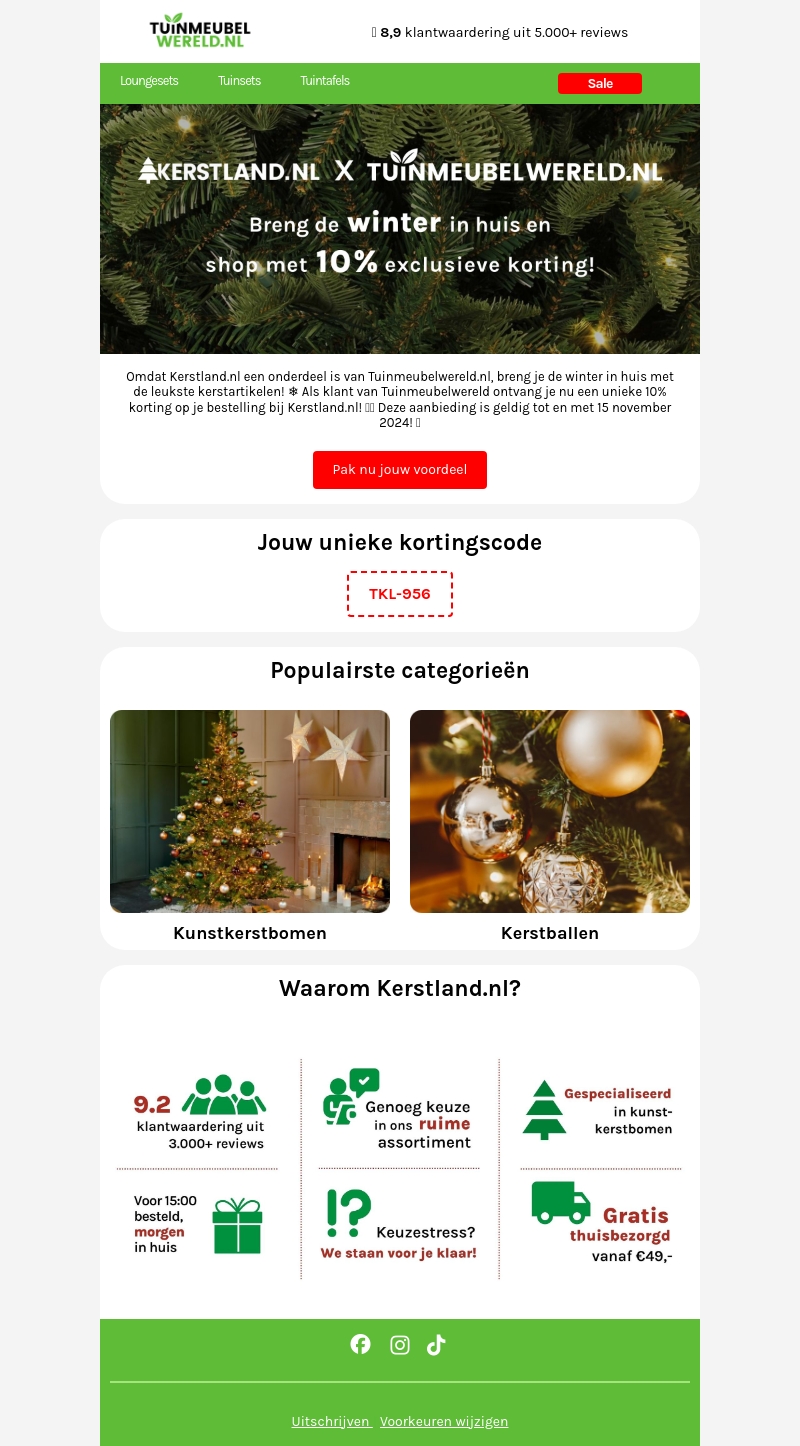 Hoi , omdat Kerstland.nl een onderdeel is van Tuinmeubelwereld.nl, ontvang je 10% korting op kerstartikelen! βοΈ