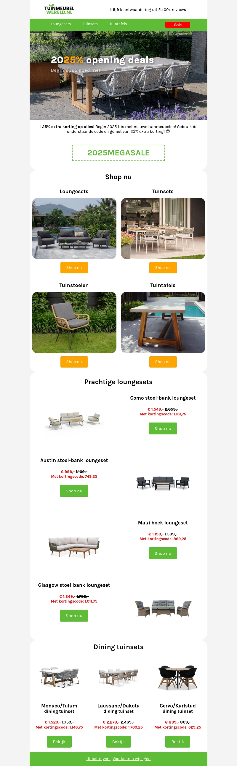 Ontvang nu 25% korting op een breed assortiment tuinmeubelen. Perfect voor een stijlvolle start van 2025! Van loungesets tot dining sets, ontdek de ideale meubels voor jouw tuin en geniet van extra kortingen met de code.
