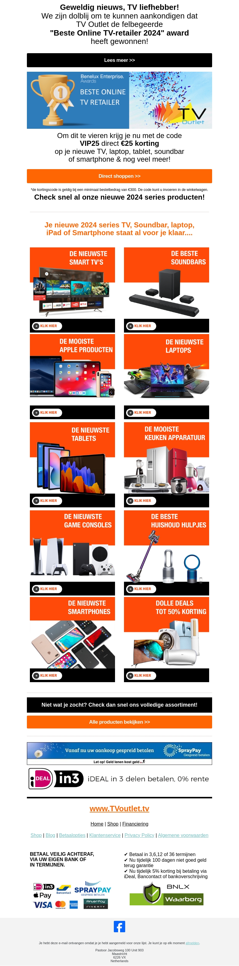 TV Outlet heeft de prestigieuze 'Beste Online TV-retailer 2024' award gewonnen. Ter ere hiervan bieden ze unieke kortingen aan op de nieuwste TV's, soundbars en meer. Met de code VIP25 krijg je direct €25 korting. Verken ook de gloednieuwe laptops, smartphones en keukenapparatuur. Bezoek de website voor alle producten en aanbiedingen. Profiteer nu van de beste deals.