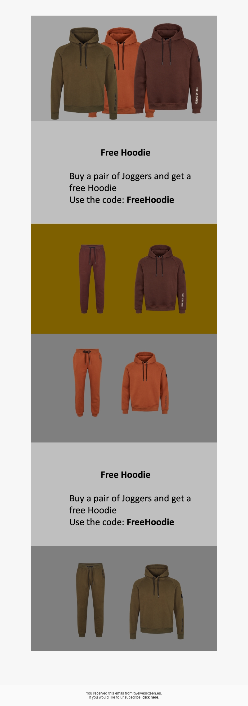 Profiteer nu van deze geweldige actie: koop een paar joggers en ontvang een gratis hoodie! Perfect voor de koudere dagen. Gebruik de code FreeHoodie bij je aankoop en geef je garderobe een upgrade. Keuze uit verschillende kleuren. Deze aanbieding is tijdelijk, dus wees er snel bij!