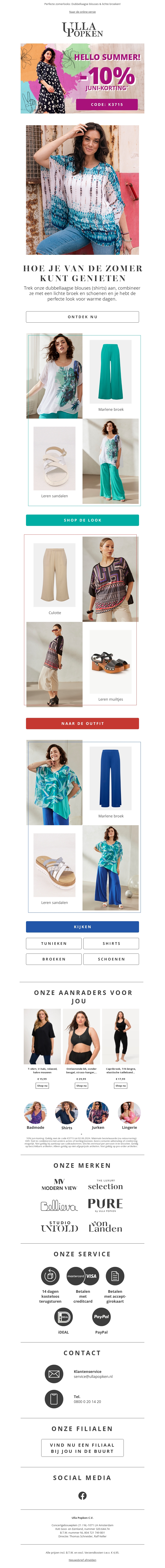 Beleef de zomer met de nieuwste collectie van Ulla Popken. Ontdek luchtige blouses en comfortabele broeken voor warme dagen. Gebruik code K3715 voor 10% korting op je aankoop. Mis deze kans niet en shop de look nu!