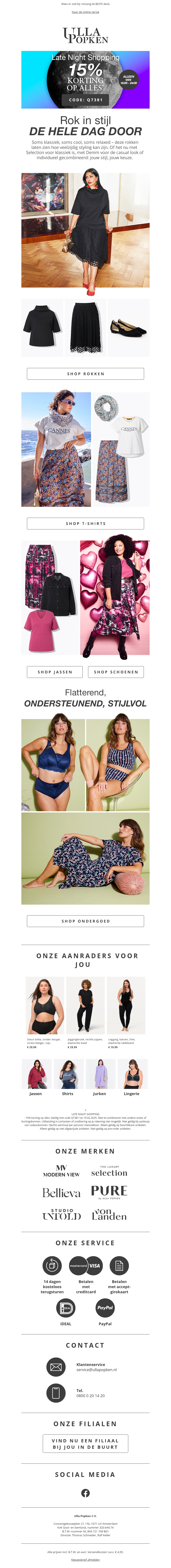 Beleef de ultieme shopping-ervaring bij Ulla Popken met 15% korting op alles tijdens de Late Night Shopping. Ontdek de nieuwste collectie mode voor elke gelegenheid. Mis deze kans niet om uw garderobe te vernieuwen met stijlvol en flatterend design.