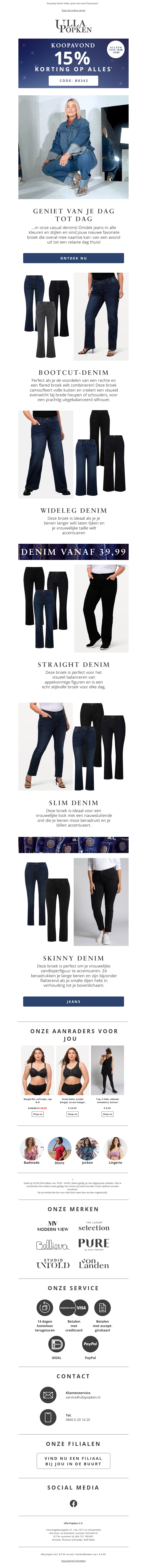 Mis deze geweldige kans niet! Met 15% korting op alles kunt u uw favoriete items nu voordeliger aanschaffen. Onze collectie bevat een breed scala aan denim stijlen, variërend van slim fit tot bootcut. Bezoek ons tijdens de volle maan kortingsdag en bespaar groot op prachtige mode.