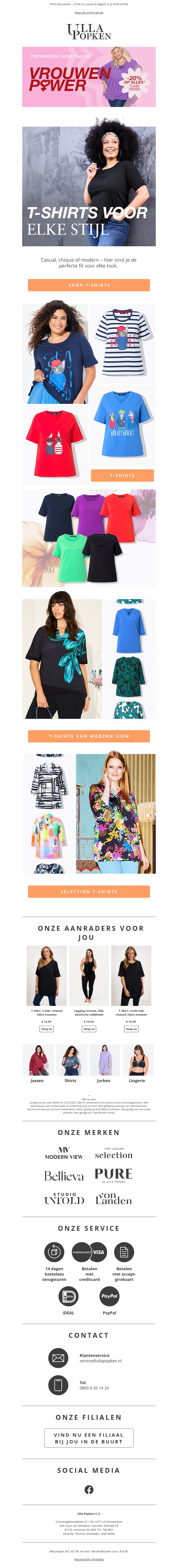 Mis deze ongelooflijke kans niet om 20% korting te krijgen op alles bij Ulla Popken. Ontdek onze nieuwste collectie T-shirts die perfect zijn voor elke stijl en gelegenheid. Van casual tot moderne stijlen, er is iets voor iedereen. Bezoek onze website om meer te ontdekken en te profiteren van deze aanbieding.