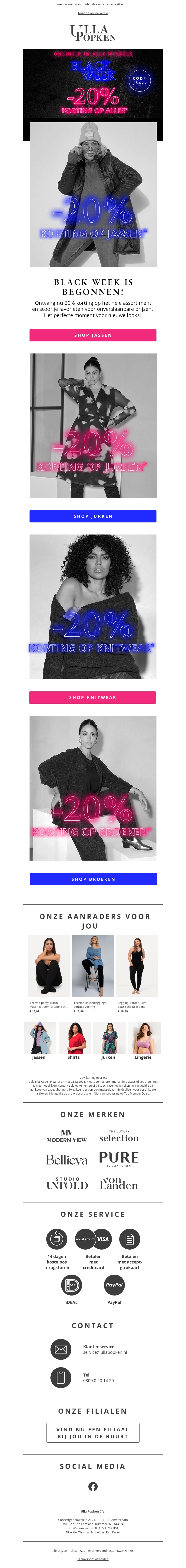Deze Black Week biedt Ulla Popken een spectaculaire 20% korting op alles! Ontdek een breed scala aan stijlvolle jassen, modieuze breiende kleding en meer. Geniet van deze aanbieding en verfris je garderobe met premium items tegen gereduceerde prijzen. Bezoek onze website en mis deze kans niet. Wissel je garderobe met de beste deals tijdens onze Black Week!