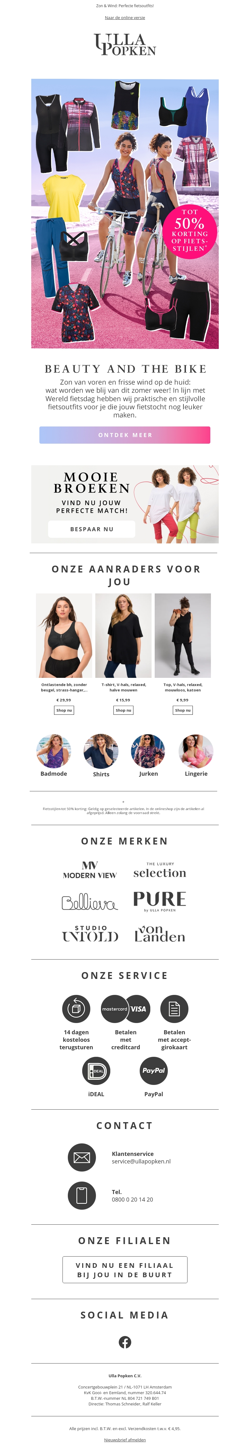 Ontdek onze nieuwste collectie fietsmode bij Lilla Popken met kortingen tot wel 50%. Van comfortabele shirts tot praktische leggings, alles wat je nodig hebt voor een plezierige fietstocht vind je hier. Wees er snel bij en sla je slag!