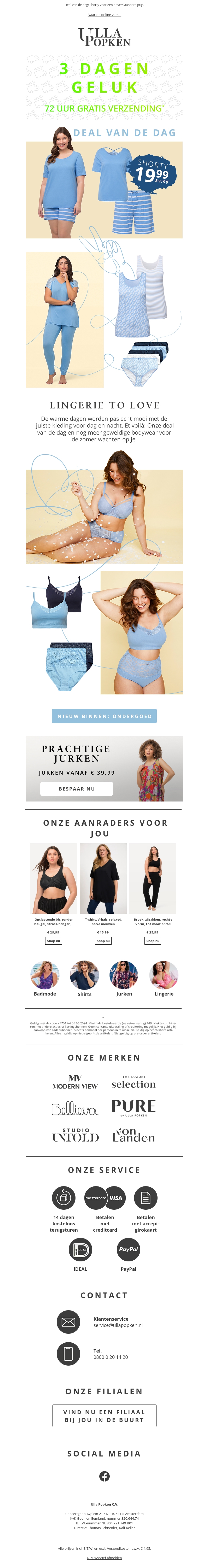 Geniet van 3 dagen geluk met 72 uur gratis verzending op je favoriete items bij Lilla Popken. Ontdek de deal van de dag en onze aanbevolen producten, waaronder lingerie, jurken en meer. Mis deze kans niet om je garderobe aan te vullen zonder verzendkosten!