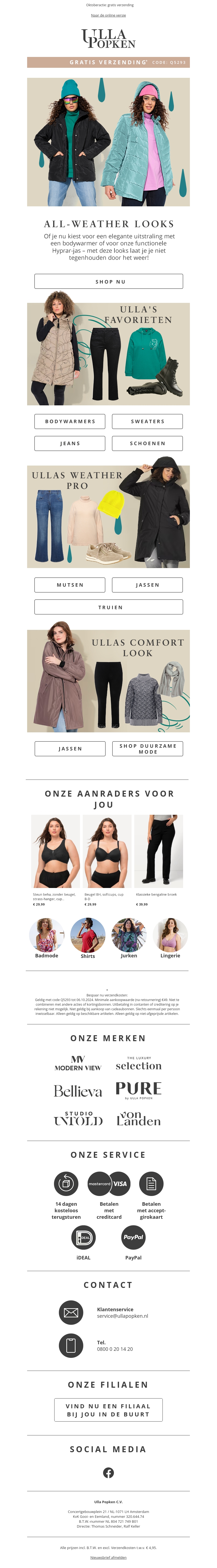 Blijf stijlvol en warm met onze nieuwste collectie all-weather looks. Van functionele jassen tot comfortabele bodywarmers, Ulla Popken biedt alles wat je nodig hebt om elk seizoen door te komen. Ontdek nu onze selectie en profiteer van gratis verzending.