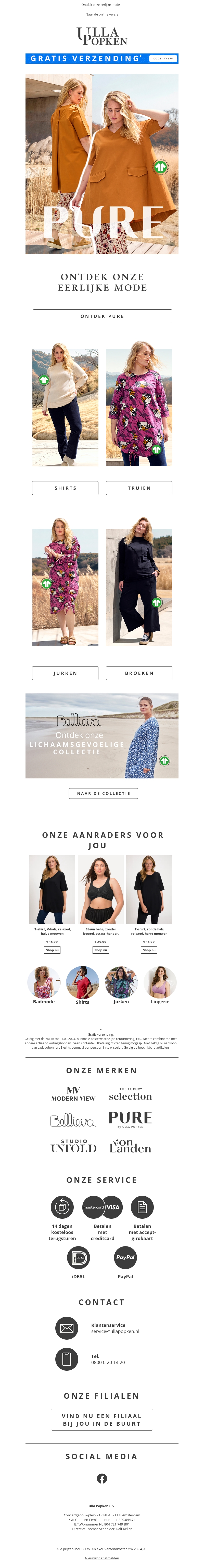 Alleen vandaag biedt Ulla Popken gratis verzending aan op hun nieuwste collectie. Ontdek de prachtige en comfortabele mode die perfect bij jouw stijl past. Van shirts en truien tot jurken en broeken, er is voor ieder wat wils. Verwen jezelf met onze aanbevolen items speciaal voor jou. Mis deze enige kans niet – shop nu en geniet van gratis verzending!