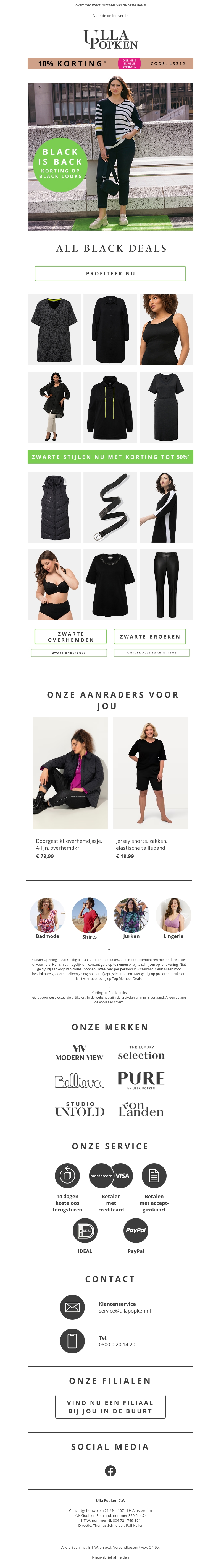 Geniet van geweldige kortingen op zwarte kledingstukken bij Lilla Popken. Kies uit een breed scala aan stijlen, van jurken tot broeken en meer. Mis deze kans niet om tot wel 50% te besparen op je favoriete zwarte items. Gebruik de kortingscode L1312 voor extra 10% korting.