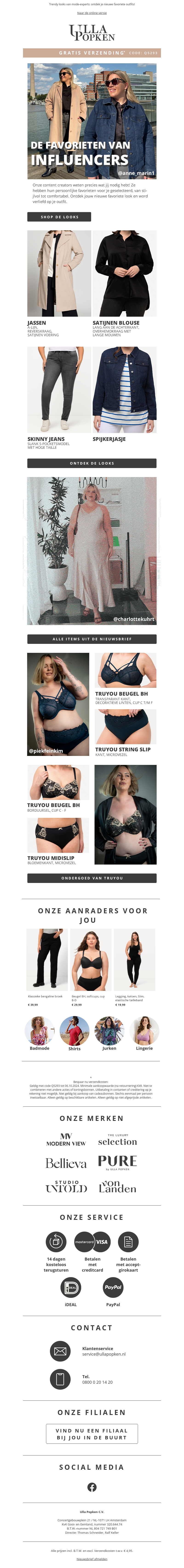 Deze nieuwsbrief toont de favoriete looks van influencers. Ontdek stijlvolle jassen, blouses, jeans en lingerie. Maak kennis met TruYou-lingeriecollectie. Profiteer van gratis verzending bij je volgende bestelling. Veel shopplezier!