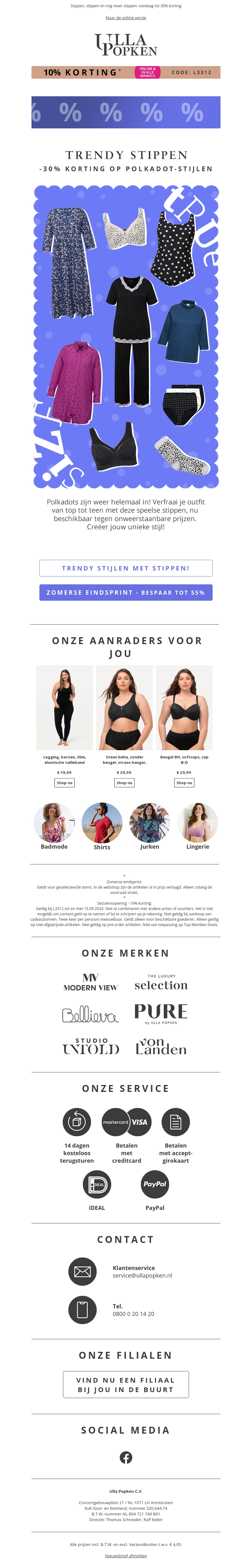 De nazomer sale is begonnen en biedt geweldige deals, inclusief 30% korting op polkadot-stijlen. Ontdek de trendy nieuwe collectie en maak jouw outfit uniek. Daarnaast zijn er speciale aanbiedingen op diverse mode-items zoals badmode, shirts, jurken en lingerie. Koop snel en bespaar tot 55%! Vergeet niet de kortingscode te gebruiken voor extra voordelen.