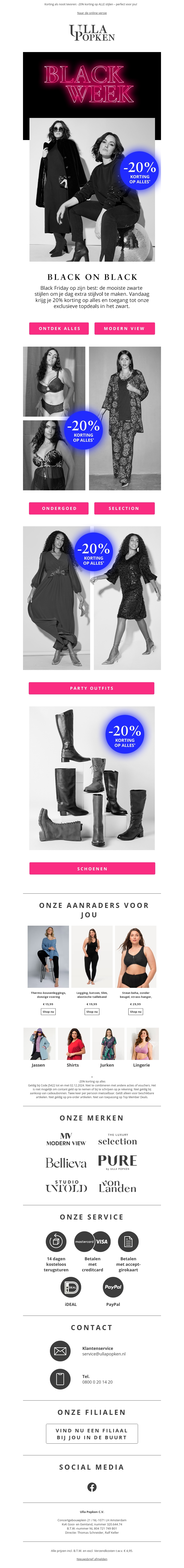 Bij Ulla Popken is het Black Week en dat betekent maar één ding: enorme kortingen! Ontvang 20% korting op alles in de winkel. Van stijlvolle jurken tot trendy schoenen, er is voor ieder wat wils. Dit is dé kans om je garderobe aan te vullen met geweldige mode-items. Bezoek de winkel of shop online om van deze aanbieding te profiteren. Wees snel, want op is op!