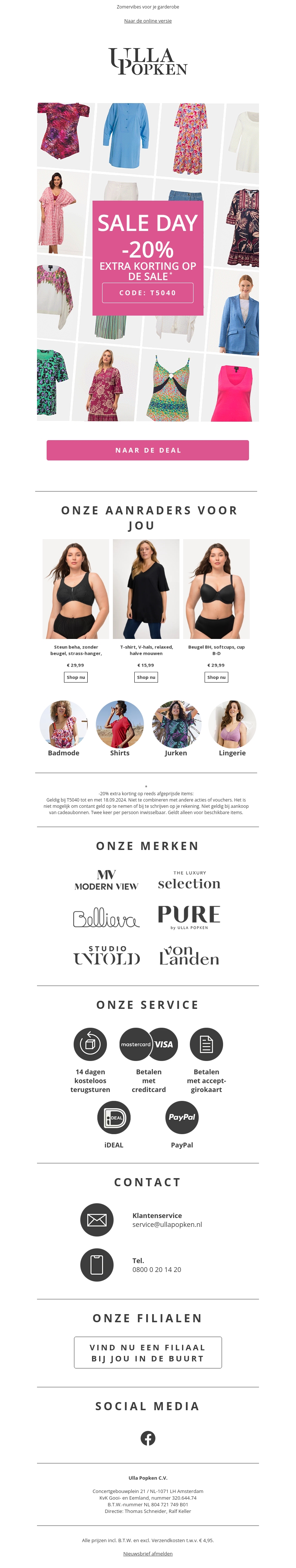 SALE DAY: bij Ulla Popken krijg je nu 20% extra korting op de al afgeprijsde items. Gebruik de code T5040 tijdens het afrekenen om van deze aanbieding te profiteren. Beperkte tijd beschikbaar, mis het niet!