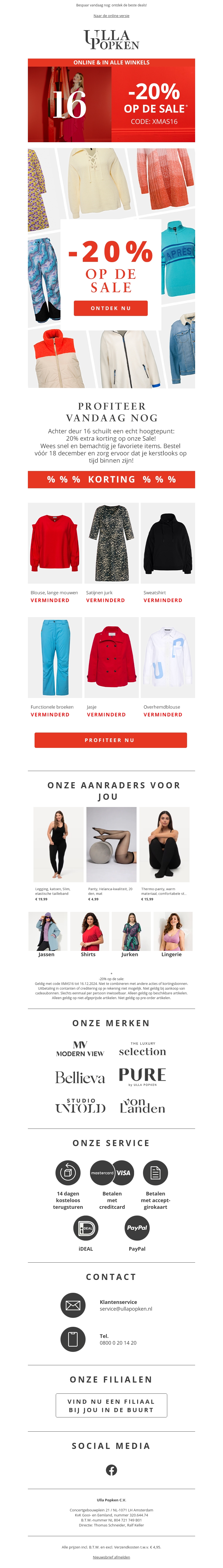 Slechts een dag om te genieten van extra kortingen op jouw favoriete items. Ontvang -20% extra korting op onze fantastische selectie van modeproducten in de sale. Zorg ervoor dat je jouw aankopen vóór 18 december doet om je kerstkleding op tijd binnen te hebben. Mis deze unieke kans niet om te besparen op modieuze stijlen.