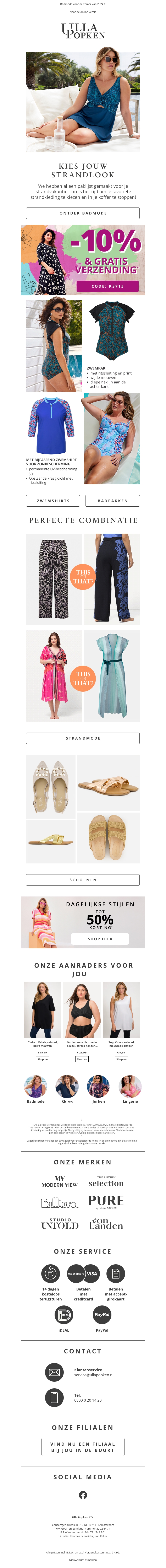 Beveiligen van gratis verzending en 10% korting bij Lila Popken. Kies jouw favoriete strandlook uit onze nieuwste collectie en profiteer van prachtige badmode en zwemshirts. Maak jouw perfecte combinatie compleet met stijlvolle strandmode en schoenen. Ontdek ook onze dagelijkse stijlen voor zachte prijzen.