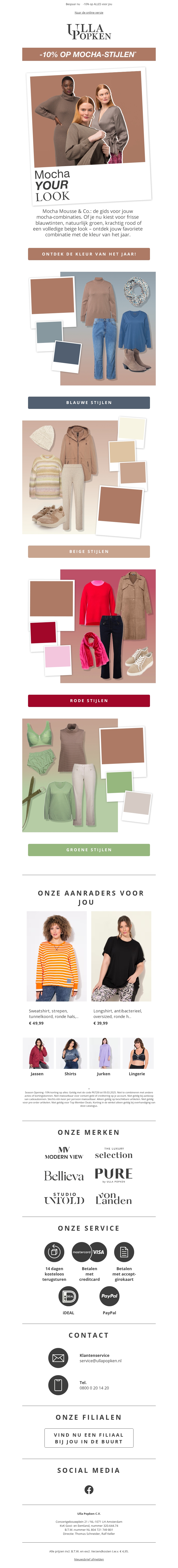 Maak kennis met de trendkleur van 2025: Mocha Mousse. Deze veelzijdige kleur vind je terug in diverse kledingstijlen van Ulla Popken. Ontdek combinaties in blauw, beige, rood, en groen en bespaar 10% op alle Mocha-stijlen. Creëer jouw eigen unieke look en wees helemaal klaar voor het nieuwe jaar.