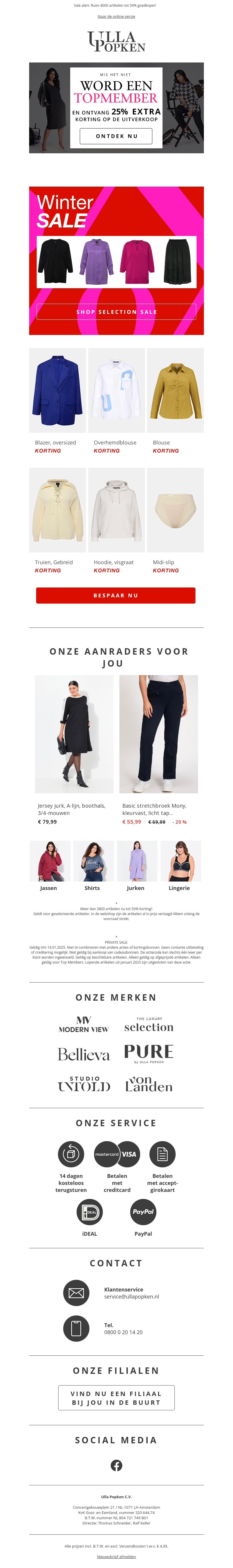 Profiteer van de kans om vandaag nog Top Member te worden en ontvang 25% extra korting op de fantastische winteruitverkoop! Ontdek een trendy selectie van kledingstukken, van jurken tot blouses en jassen. Het is de perfecte kans om je garderobe tegen gereduceerde prijzen aan te vullen. De korting geldt alleen vandaag, dus wacht niet te lang. Bezoek onze website en shop je favorieten.