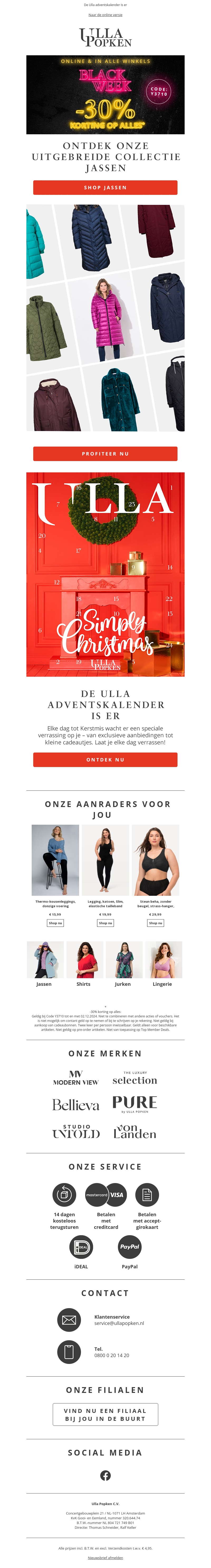 De Black Week is begonnen bij Ulla Popken. Geniet van maar liefst 30% korting op alle artikelen. Dit is het moment om je favoriete kledingstukken in te slaan. Of je nu op zoek bent naar winterjassen, jurken of comfortabele loungewear, alles is afgeprijsd. Gebruik de kortingscode in de nieuwsbrief voor extra voordeel. Laat deze kans niet aan je voorbijgaan!