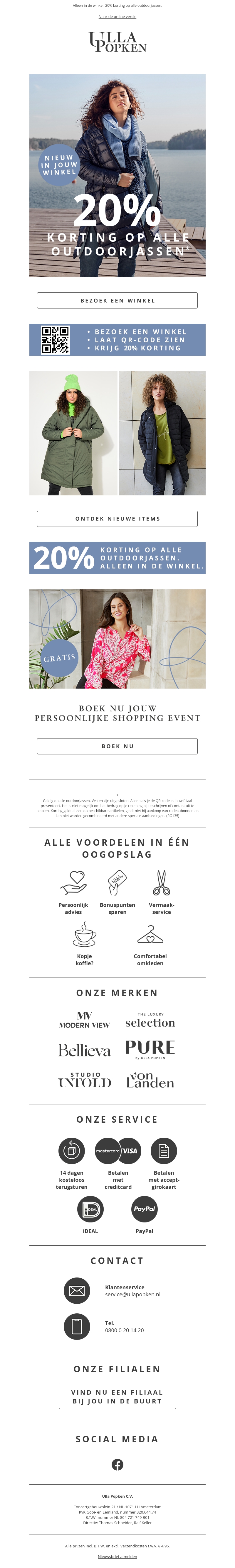 Haal nu je nieuwe outdoorjas met een korting van 20% bij Ulla Popken. Alleen verkrijgbaar in de winkel. Boek ook je persoonlijke shopping event en profiteer van gratis advies en unieke voordelen.