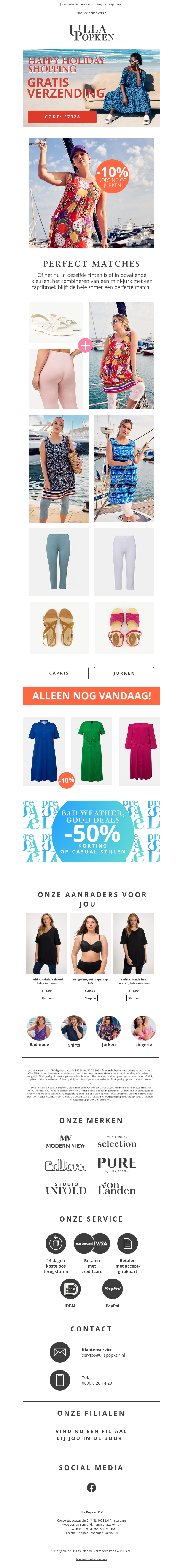 Ga stijlvol de zomer in met onze geweldige collectie jurken. Ulla Popken biedt nu 10% korting op geselecteerde jurken en gratis verzending op je bestelling. Vind de perfecte jurk voor elke gelegenheid en maak je look compleet met onze bijpassende capris en sandalen. Shop vandaag nog en bespaar!