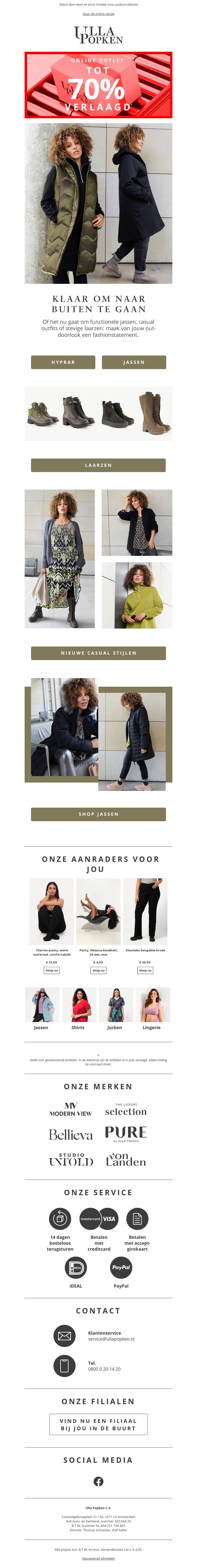 Ontdek de spectaculaire aanbiedingen in de online outlet van Ulla Popken. Profiteer nog vandaag van kortingen tot wel 70% op stijlvolle jassen, comfortabele schoenen en moderne outfits. Voor ieder wat wils in onze uitgebreide collectie. Zorg dat je er snel bij bent want op is op!