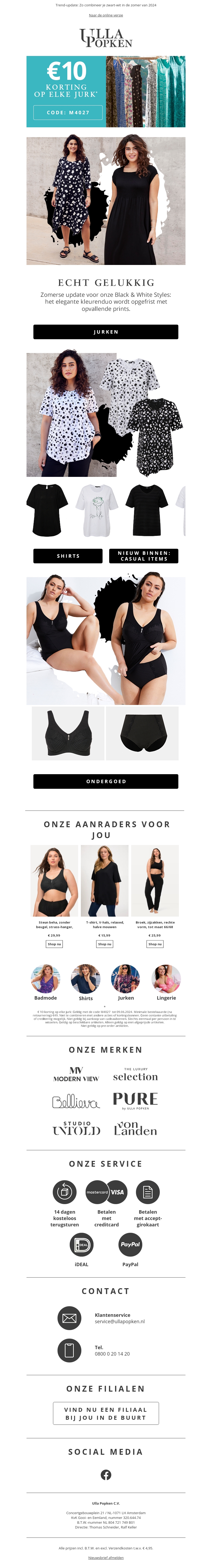Deze week profiteer je van €10 korting op elke jurk bij Lilla Popken. Ontdek onze elegante Black & White Styles, perfect voor een zomerse update. Daarnaast presenteren we onze nieuwste casual items en stijlvolle lingerie. Mis deze kans niet en shop jouw favoriete stukken!