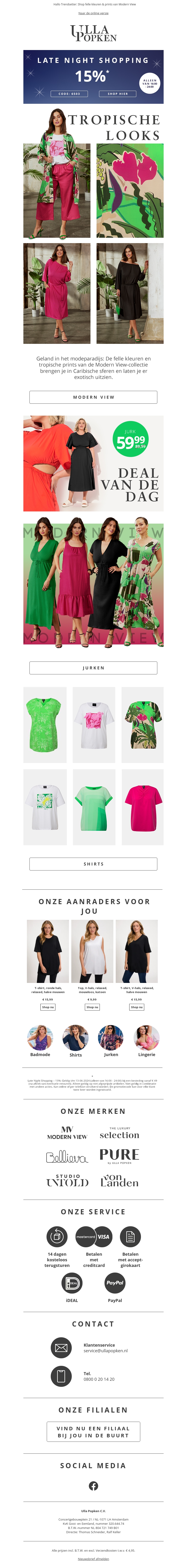 Onze laatste kans aanbieding biedt u 15% korting op prachtige tropische looks. Mis deze kans niet om uw garderobe te vernieuwen met levendige kleuren en tropische prints uit onze Modern View collectie.