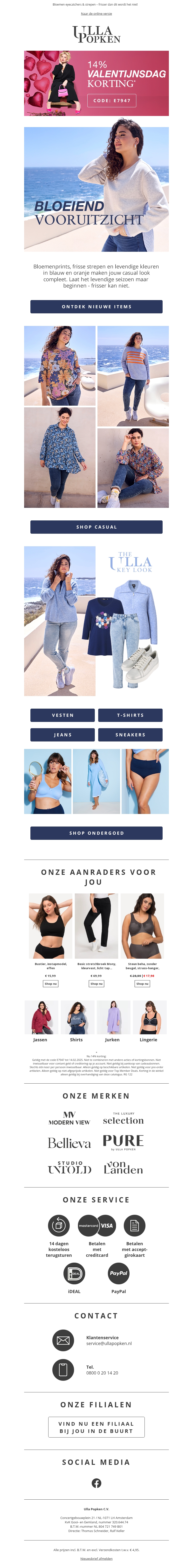Ontdek de prachtige Valentijnsdag collectie bij Ulla Popken met een exclusieve korting van 14%! Shop stijlvolle casual kleding en verwen jezelf met ons aanbod aan vesten, T-shirts, jeans en sneakers. Laat je inspireren door onze bloeiende vooruitzichten en upgrade je garderobe vandaag nog.