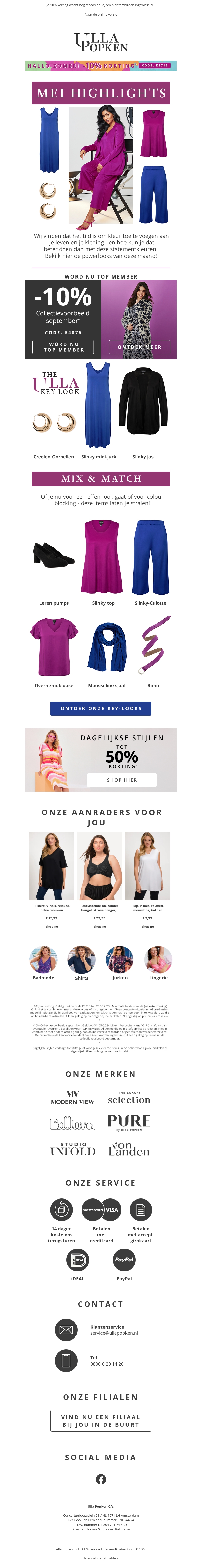In onze Mei Highlights nieuwsbrief presenteren wij frisse kleuren en krachtige looks voor dit seizoen. Van stijlvolle jurken tot kleurrijke tops, wij hebben alles om jouw garderobe een boost te geven. Ontdek de nieuwste must-haves en profiteer van exclusieve kortingen. Mis het niet!