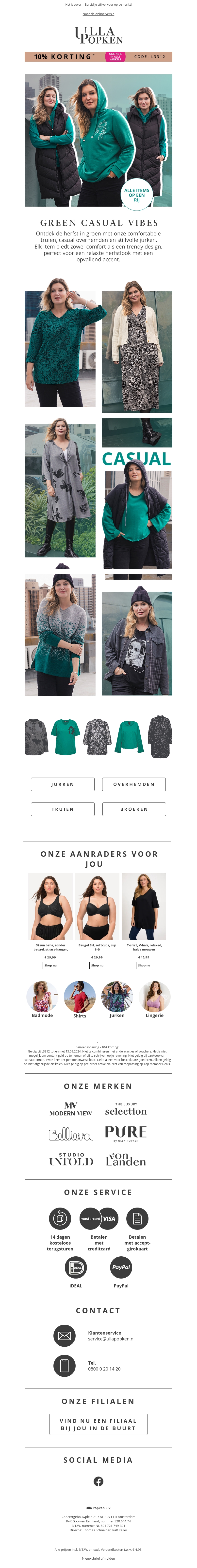 Grijp je kans en ontvang 10% korting op de nieuwste casual modecollectie van Ulla Popken. Verken trendy groene tinten, comfortabele stoffen en stijlvolle ontwerpen. Gebruik de code: 1212 bij het afrekenen. Geldig voor een beperkte tijd.