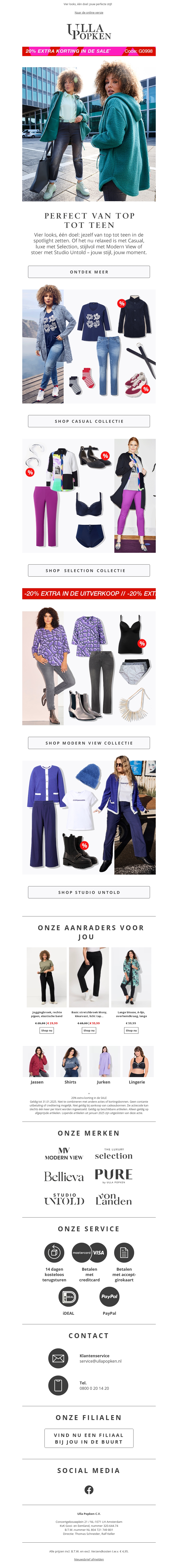 Ontdek de laatste modetrends met een exclusieve extra korting van 20% in onze SALE. Kies uit een breed scala aan stijlen, waaronder casual, chic en modern. Mis deze kans niet om je garderobe te vernieuwen met geweldige deals. Shop nu de nieuwste collecties van de merken die je kent en vertrouwt. Ons aanbod biedt voor ieder wat wils, van comfortabele basics tot opvallende topstukken. Verwen jezelf met nieuwe outfits tegen onverslaanbare prijzen.