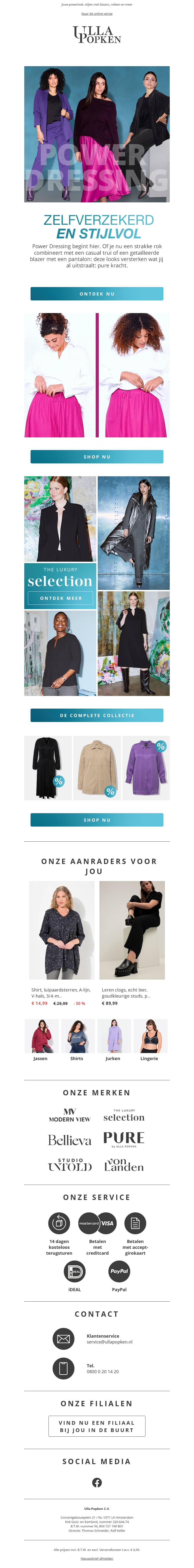 Ontdek de nieuwste collectie van Ulla Popken met krachtige blazers en elegante rokken. Deze items zijn perfect voor het creΓ«ren van zelfverzekerde en stijlvolle looks. Maak je outfit compleet met onze exclusieve selectie en geniet van tijdloze elegantie.