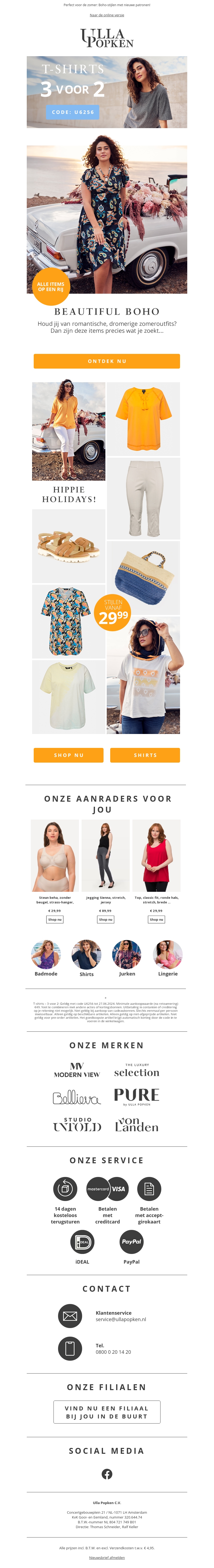 Mis deze tijdelijke aanbieding niet! Koop nu drie topjes voor de prijs van twee bij Lilla Popken. Bekijk ook onze nieuwste zomercollecties en maak je garderobe compleet met onze romantische en boho stijlen. Ga voor stijl en comfort deze zomer.