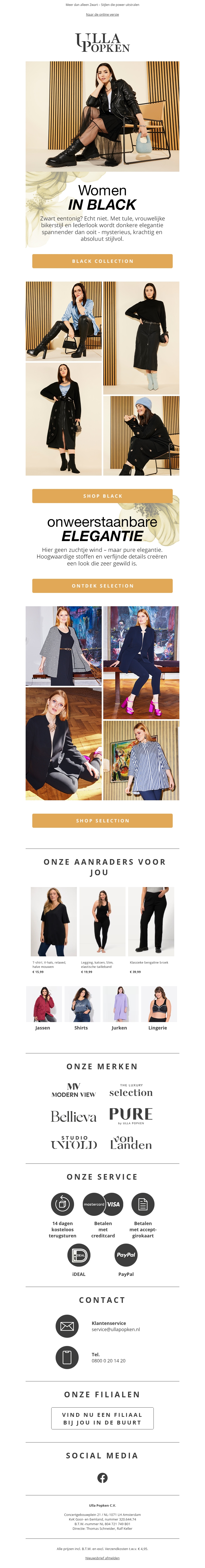 Zwart heeft nog nooit zo spannend geleken met de Ulla Popken collectie. Ontdek stijlen die tulle, leer en biker-chic combineren voor een unieke look. Van elegante jurken tot frisse tops, deze collectie heeft alles wat je nodig hebt voor een gedurfde garderobe. Hoogwaardige stoffen en verfijnde details zorgen voor ultieme elegantie. Blader door onze suggesties en kies je favorieten om te stralen.