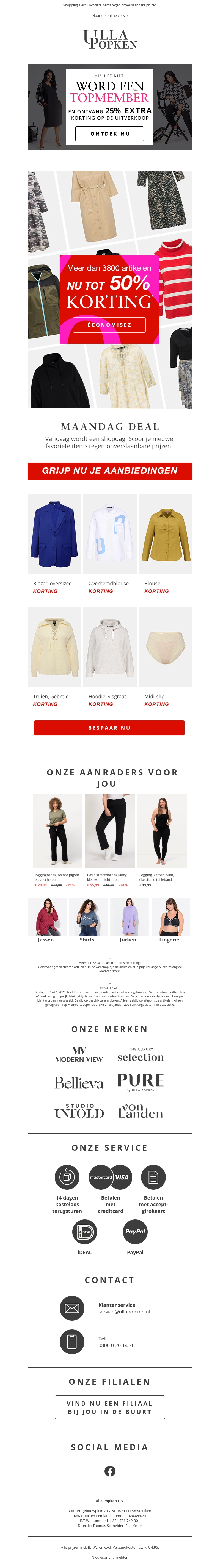 Word een Top Member bij Ulla Popken en profiteer van 25% extra korting op de uitverkoop! Ontdek meer dan 3800 artikelen met kortingen tot 50%. Mis de Maandag Deal niet voor de nieuwste trends tegen scherpe prijzen. Bezoek onze merken en geniet van eenvoudige betaalmogelijkheden. Neem vandaag nog contact met ons op voor meer informatie.