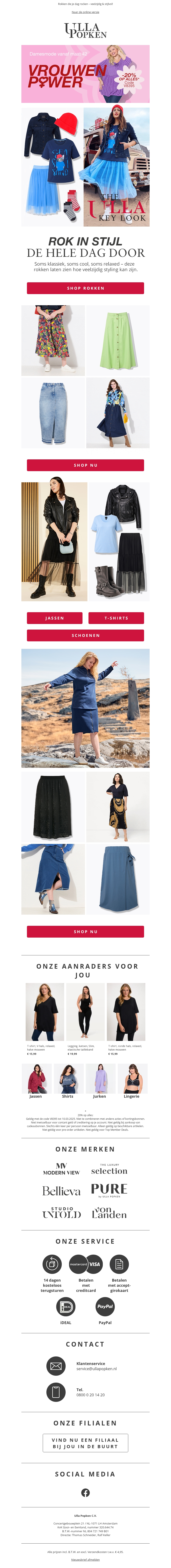 Profiteer nu van 20% korting op verschillende stijlen van damesmode. Ontdek ons uitgebreide assortiment van rokken, t-shirts en jassen. Maak je look compleet met onze stijlvolle selecties. Vergeet niet onze aanraders te bekijken voor meer unieke opties.