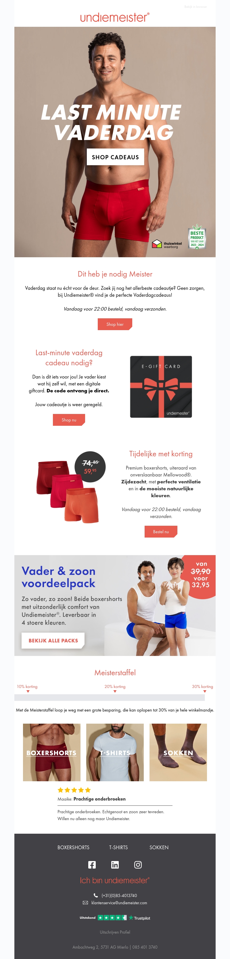 Vaderdag staat voor de deur en Undiemeister biedt de ultieme cadeaus. Van stijlvolle boxershorts en T-shirts tot sokken, je vindt de beste last-minute aanbiedingen. Bestel voor 22:00 en krijg je cadeau dezelfde dag nog geleverd. Mis de tijdelijke kortingen en voordeelpacks niet!