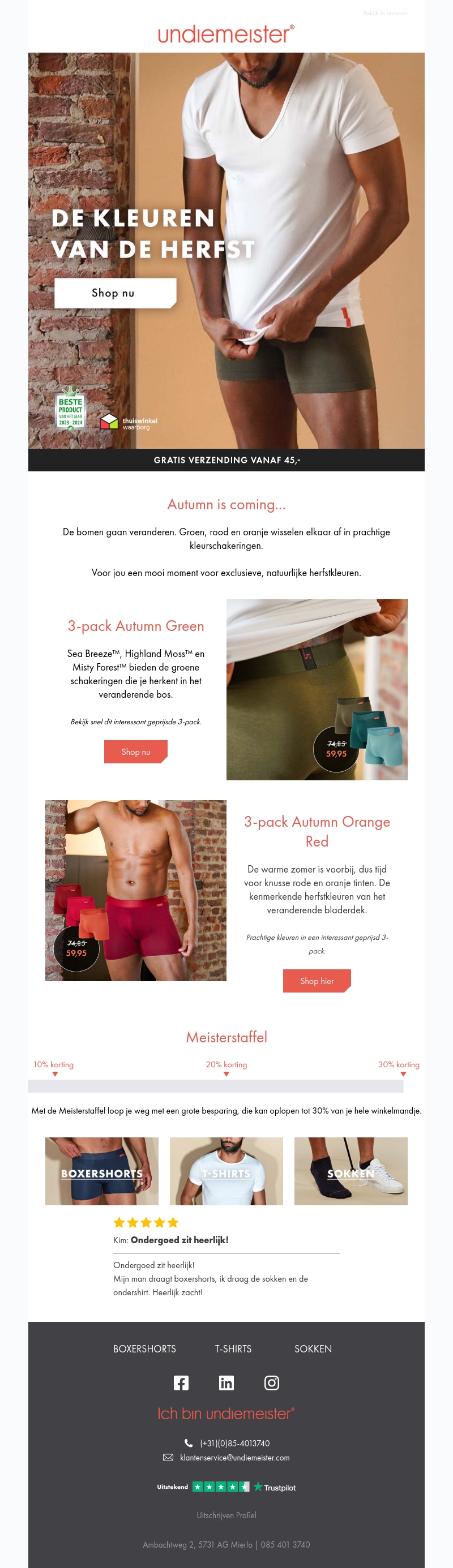 De herfst is hier en dat vieren we met onze nieuwe collectie! Ontdek onze 3-pack Autumn Green en Autumn Orange Red boxershorts met prachtige seizoenskleuren. Profiteer van gratis verzending vanaf €45 en bespaar met de Meisterstaffel. Mis deze geweldige deals niet!