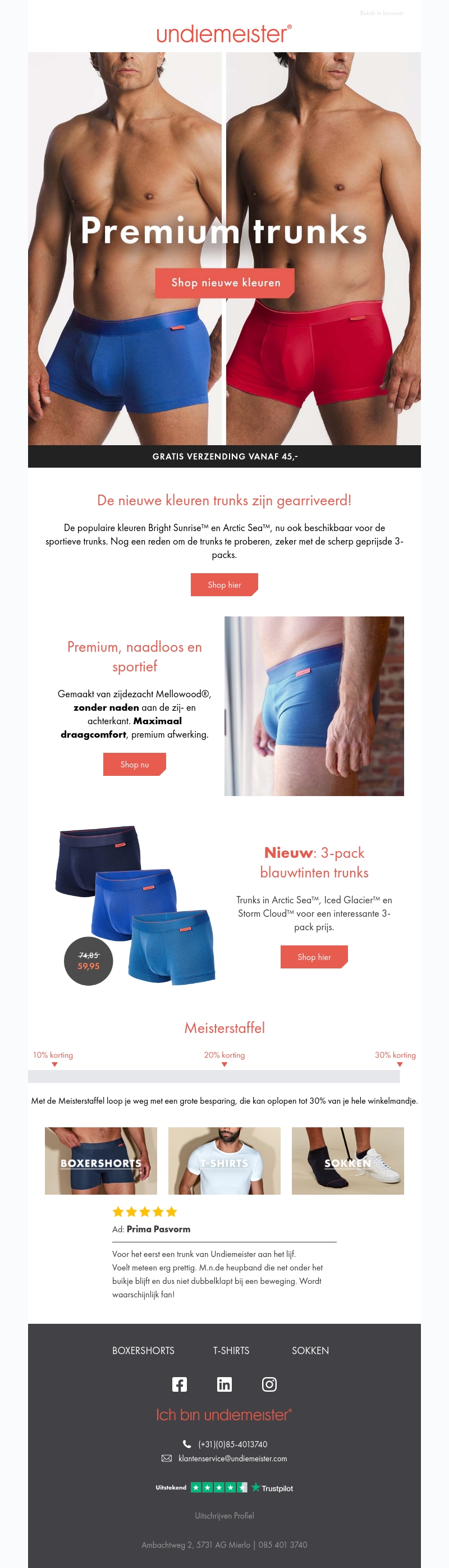 De nieuwe premium trunks van Undiemeister zijn gearriveerd in twee stijlvolle kleuren: Bright Sunrise™ en Arctic Sea™. Gemaakt van zijdezacht Mellowood®, bieden ze maximaal draagcomfort zonder naden. Profiteer nu van onze scherp geprijsde 3-packs en de Meisterstaffel kortingen tot 30%.