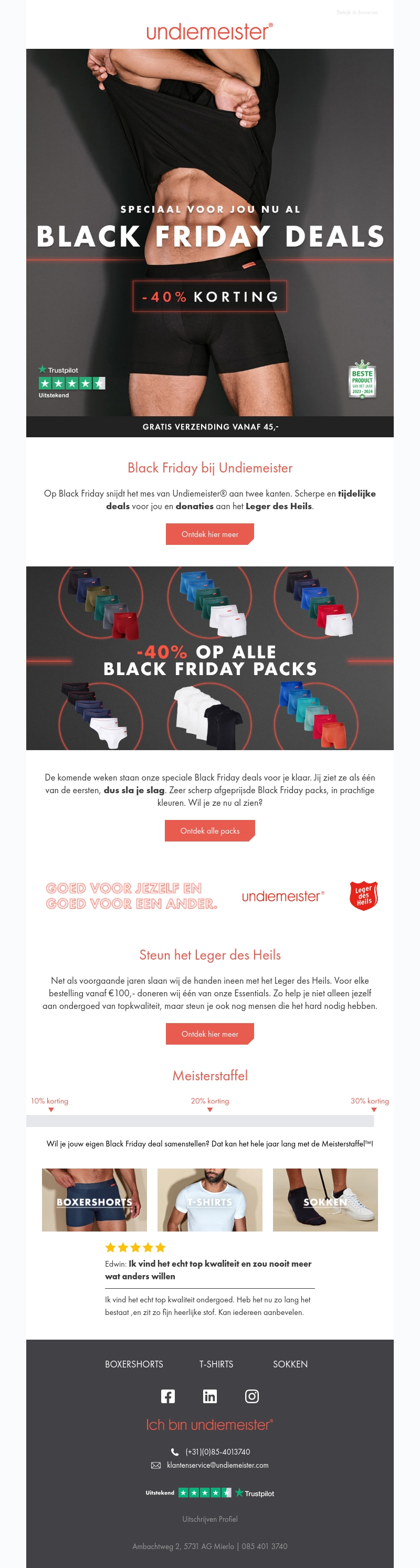 Ontdek de speciale Black Friday deals bij Undiemeister en scoor topkwaliteit ondergoed voor een aantrekkelijke prijs. Bespaar 40% op je aankopen en steun tegelijkertijd het Leger des Heils. Wees er snel bij en mis deze unieke deals niet, perfect voor jezelf en om cadeau te doen.
