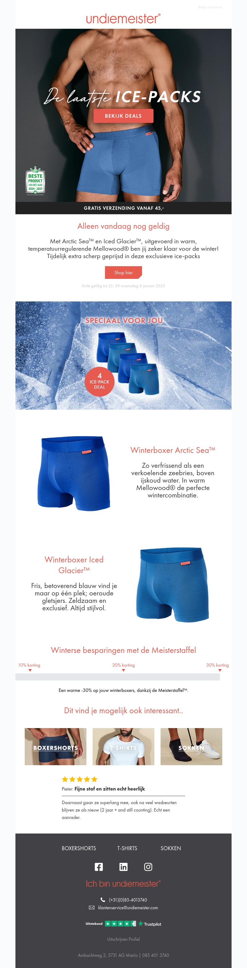 Grijp je kans met de exclusieve Ice-Packs van Undiemeister. Ontworpen met Arctic Sea™ en Iced Glacier™, bieden deze boxers ultiem comfort en stijl. De unieke Mellowood® stof zorgt voor warmte en regulering. Tijdelijk verkrijgbaar met aantrekkelijke korting. Gratis verzending bij bestellingen vanaf €45.