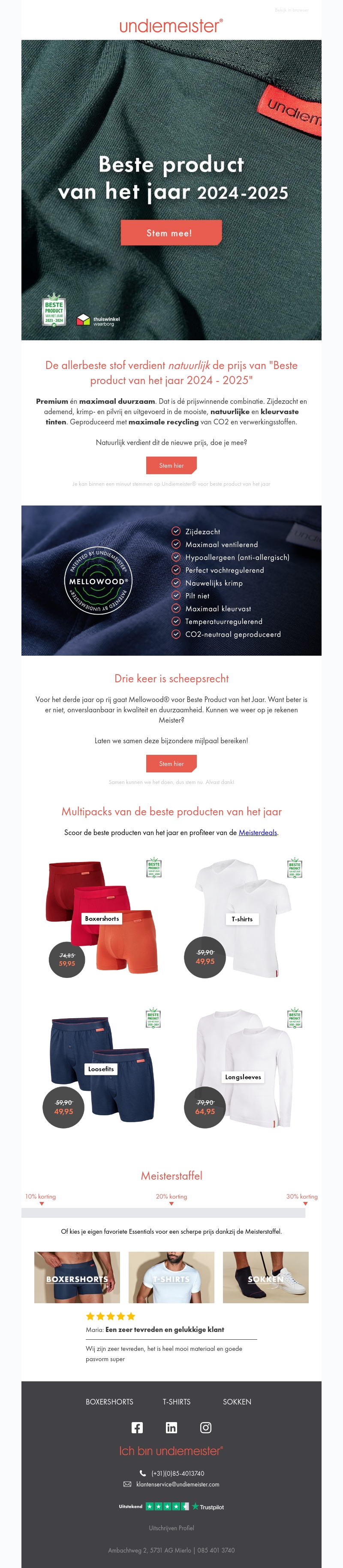 Het is tijd om te stemmen op het beste product van het jaar 2024-2025. Undiemeister biedt premium en maximaal duurzame producten met innovatieve stoffen zoals Mellowood®. Ontdek de multipacks van de beste producten, van boxershorts tot longsleeves, en geniet van meesterdeals tot wel 30% korting. Doe mee en ervaar ultiem comfort!