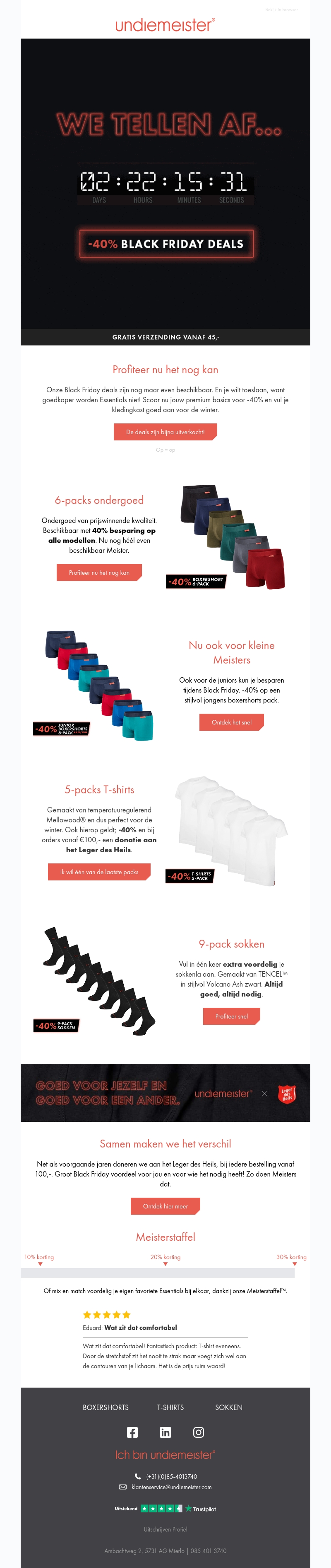 Laat de Black Friday kortingen van Undiemeister niet aan je voorbij gaan. Profiteer van tot wel 40% korting op kwaliteitsondergoed, stijlvolle t-shirts en sokken. Grijp deze kans nu en upgrade je wintergarderobe. Als extra bonus, met iedere bestelling boven €100,- gaat er een donatie naar het Leger des Heils. Mis deze deals niet!