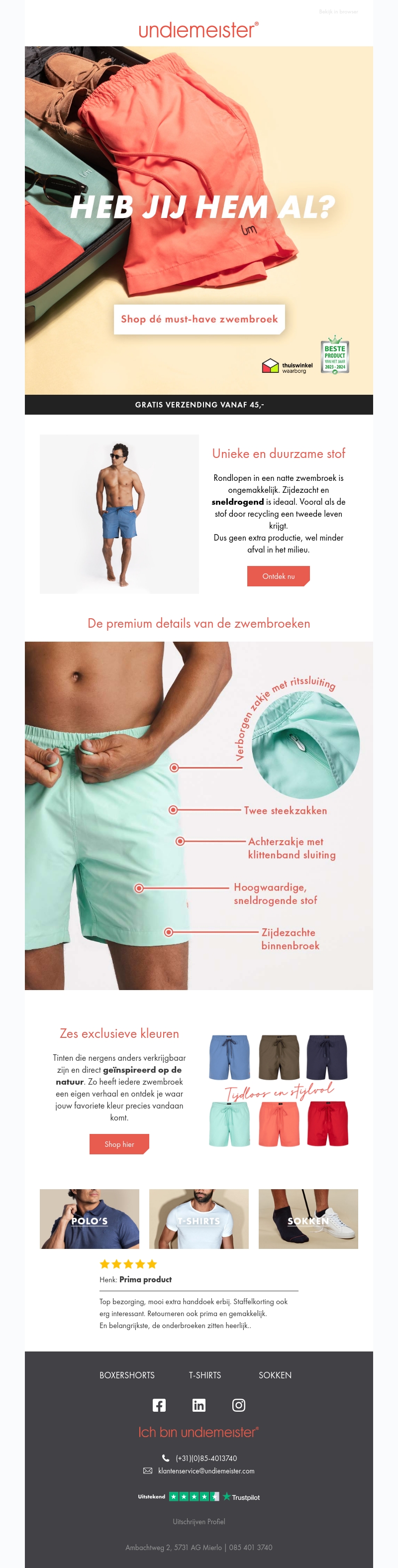 Ervaar de perfectie van de Undiemeister zwembroek! Gemaakt van unieke, duurzame stoffen die zijdezacht en sneldrogend zijn. Verkrijgbaar in zes exclusieve kleuren, met premium details zoals verborgen zakjes en hoogwaardige binnenvoering. Gratis verzending vanaf 45€. Shop nu en bereid je voor op een stijlvolle zomer!