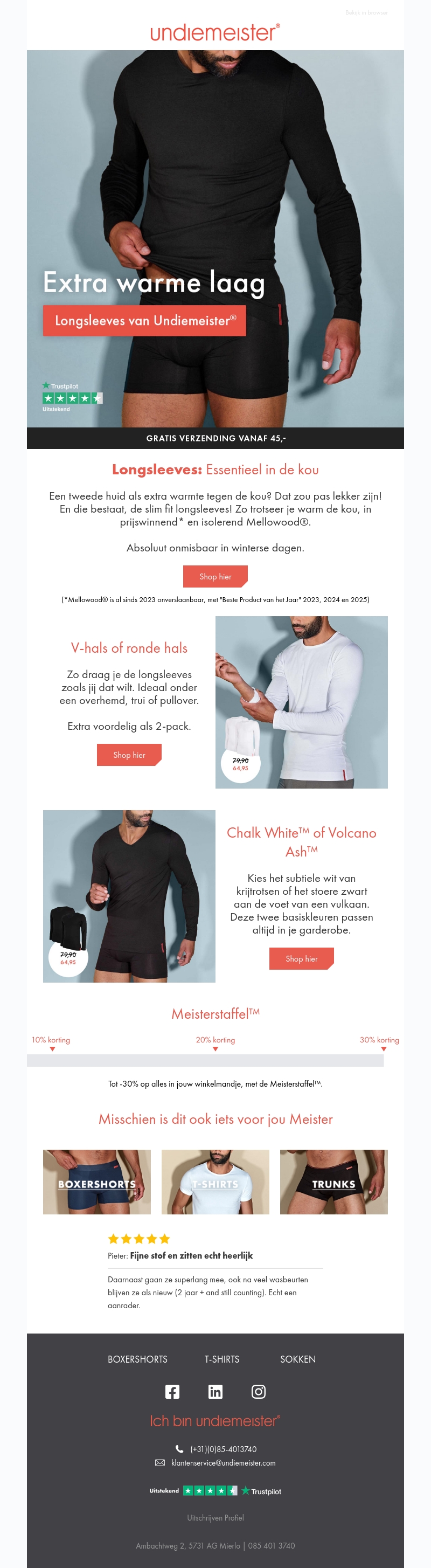 Ontdek de premium longsleeves van Undiemeister. Gemaakt van isolerend Mellowood®, bieden ze je de perfecte extra laag warmte tijdens koude dagen. Verkrijgbaar in V-hals en ronde hals, en in de kleuren Chalk White™ en Volcano Ash™. Uniforme stijl met een knipoog naar comfort.