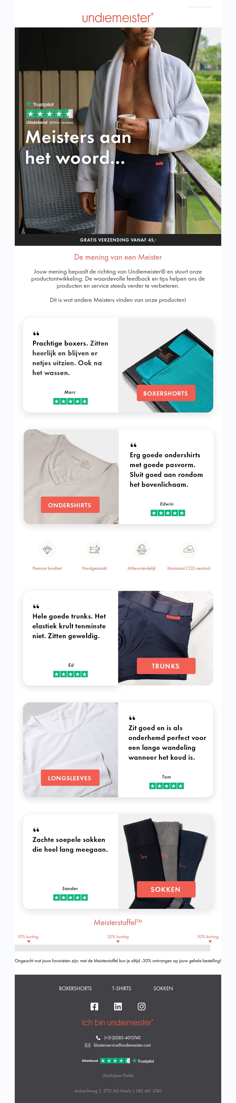 Lees de meningen van tevreden gebruikers over Undiemeister. Hun feedback helpt bij het verbeteren van productkwaliteit en service. Ontvang tips voor boxershorts, ondershirts, trunks, longsleeves en sokken. Maak gebruik van de Meisterstaffel aanbieding voor extra korting.