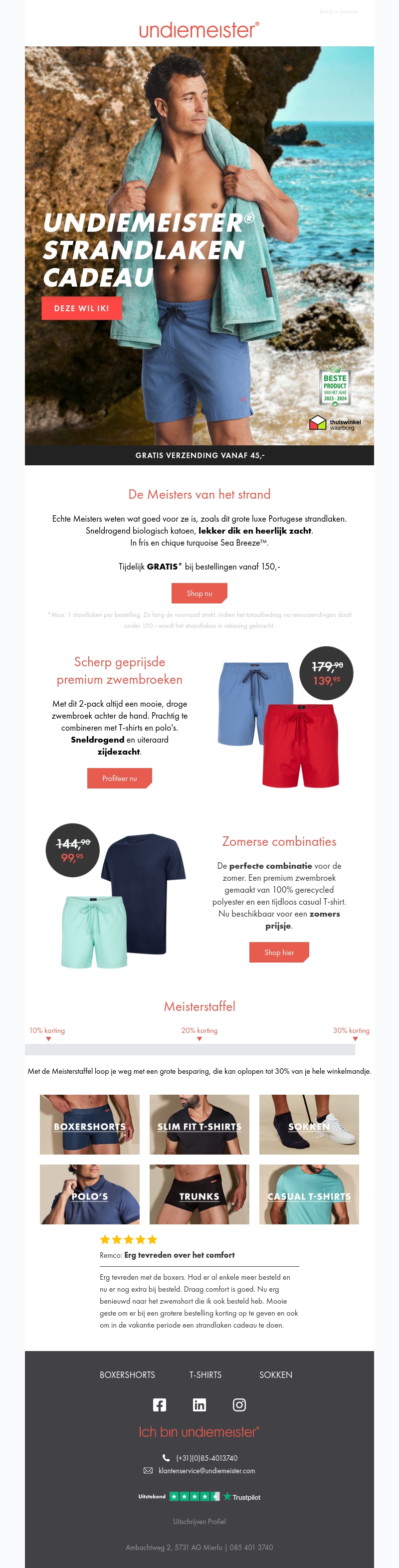 Geniet van een luxe gratis strandlaken bij bestellingen vanaf €150 bij Undiemeister. Profiteer ook van scherpe prijzen op premium zwemkleding en zomerse combinaties. Ontvang tot 30% korting op onze beste producten met de Meisternivellen.