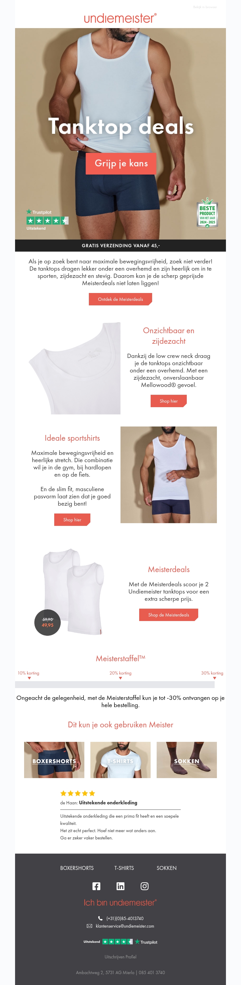 Ontdek de nieuwste tanktop deals van Undiemeister en geniet van maximaal comfort en bewegingsvrijheid. Deze tanktops zijn onzichtbaar onder een overhemd en voelen zijdezacht aan. Ideaal voor zowel sport als dagelijks gebruik. Mis de Meistersdeals niet en bespaar op je aankoop.